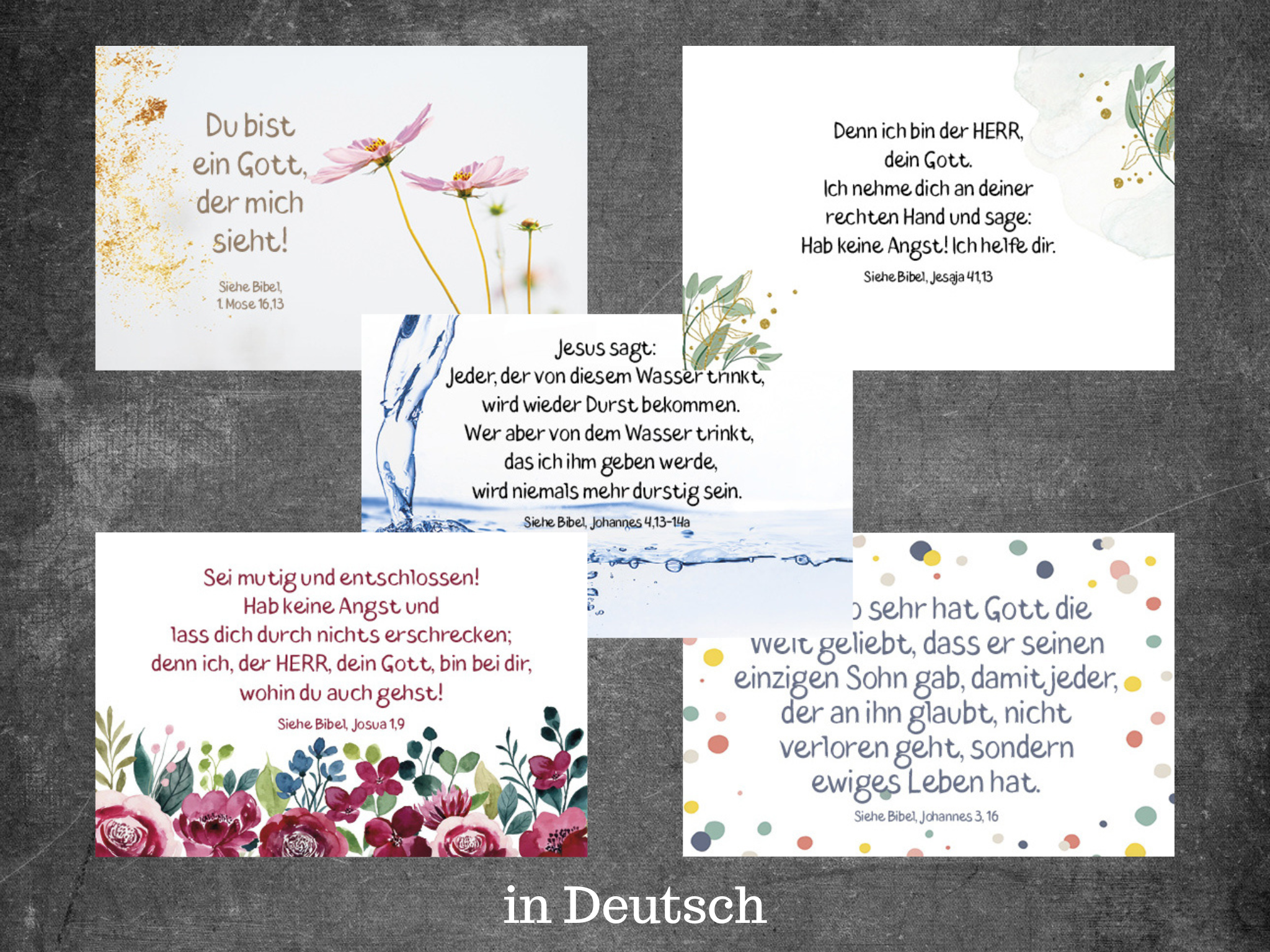 Diese zweisprachigen Faltkärtchen eignen sich besonders zur Weitergabe an Frauen. Die farbenfrohen Motive sind ein echter Hingucker und die Verse machen Mut.
