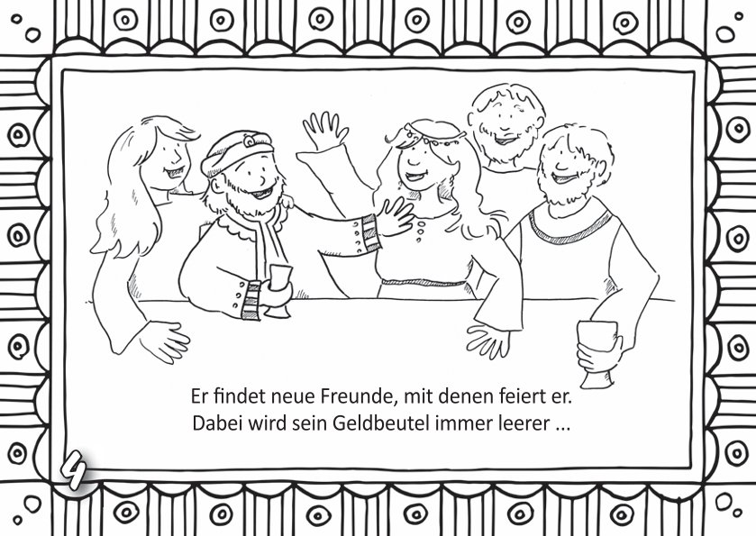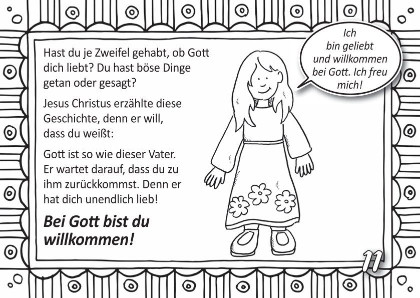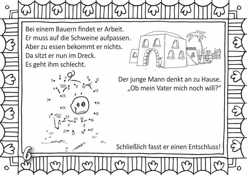 Handlich im A6-Format können die Kinder lesen, malen, rätseln oder durch Labyrinthe wandern und sich dabei spielerisch mit der Geschichte von dem "Verlorenen Sohn" auseinandersetzen. Auf der letzten Seite wird kurz erklärt, welche Bedeutung diese Geschichte auch für ihr Leben hat: Sie können jederzeit zu Gott zurückkommen!