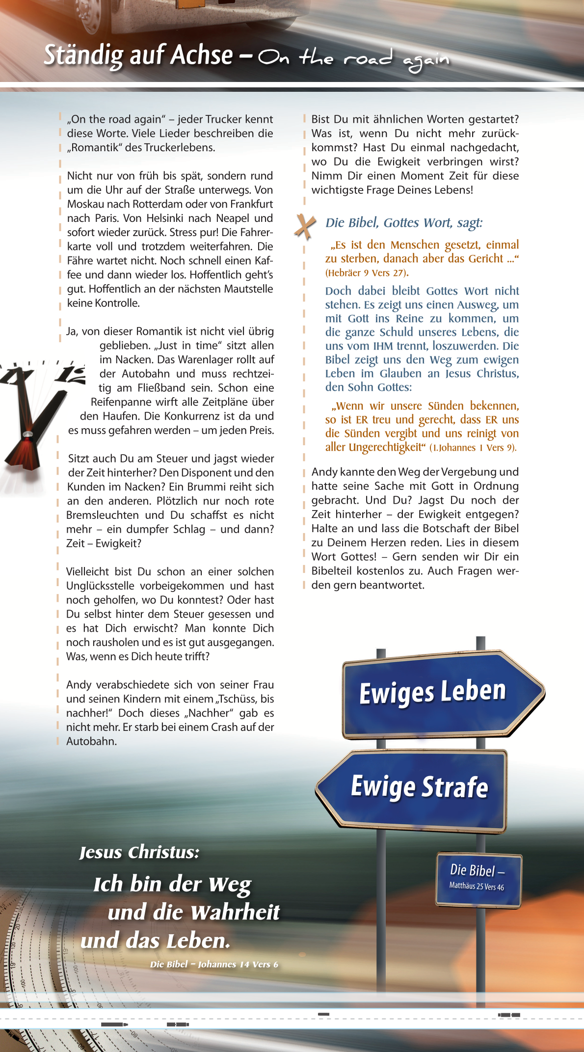 Ein Flyer mit einem evangelistischen Text in Deutsch zu dem Satz "Ständig auf Achse".
