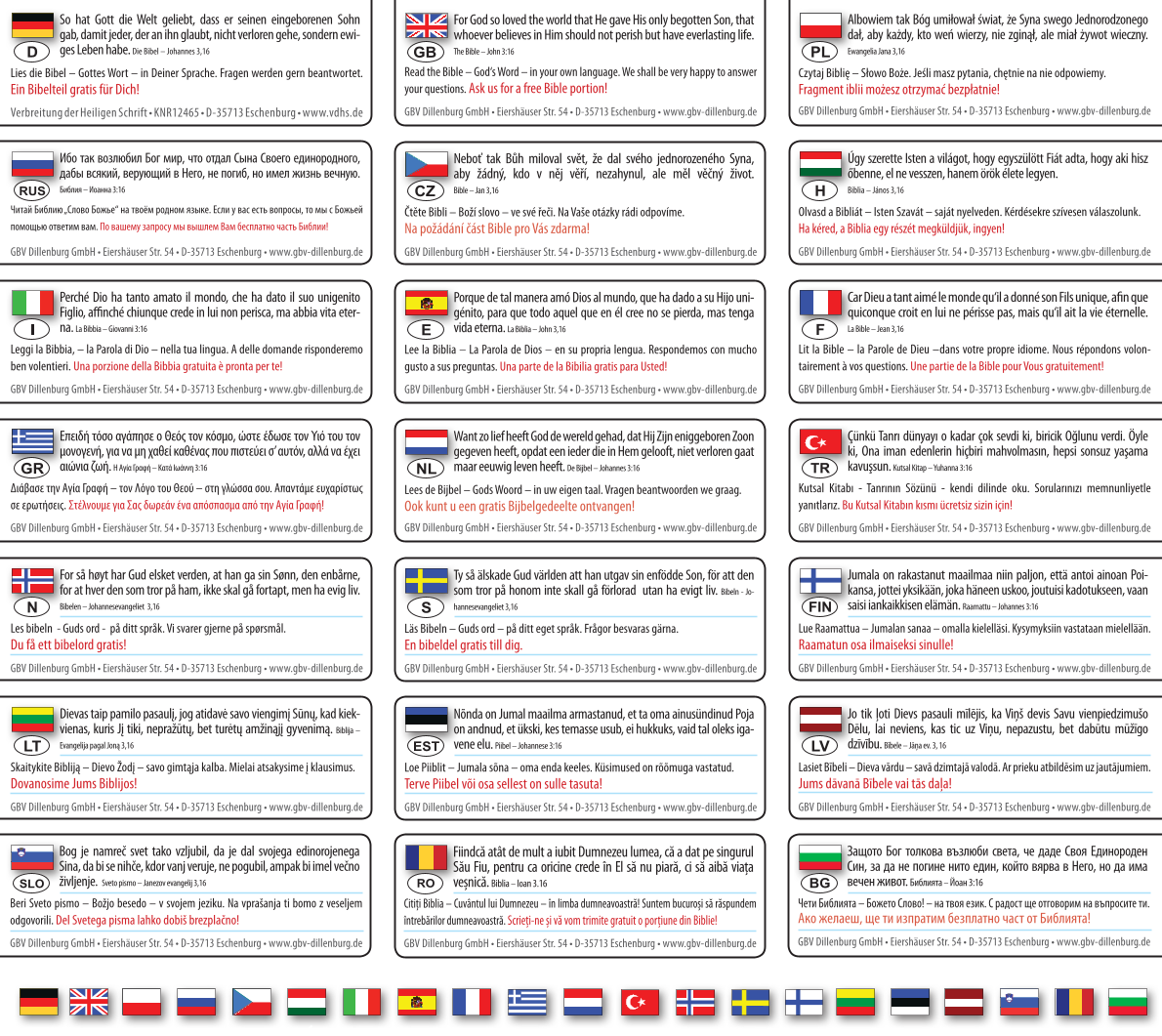 Mit Johannes 3,16 in 21 Sprachen und einem Gutschein für ein Neues Testament + Infomaterial.