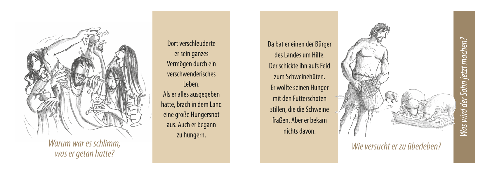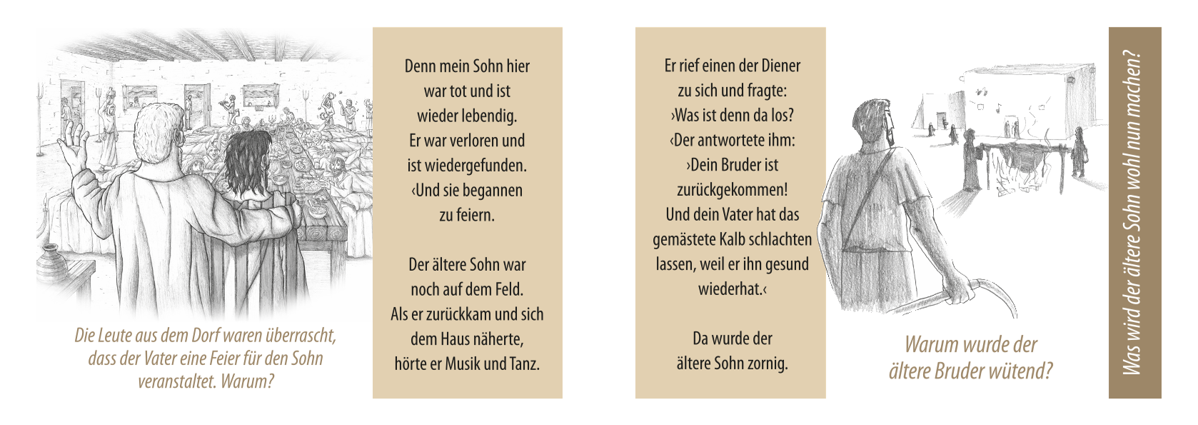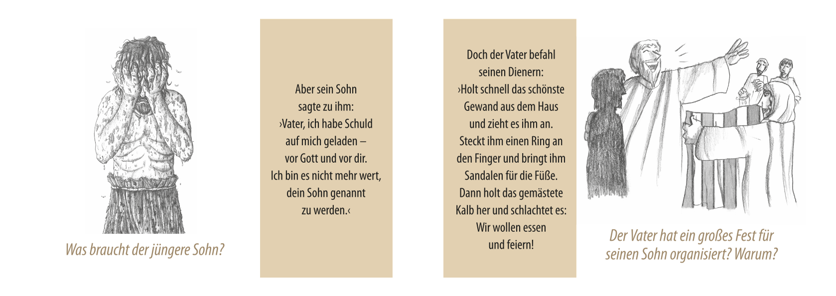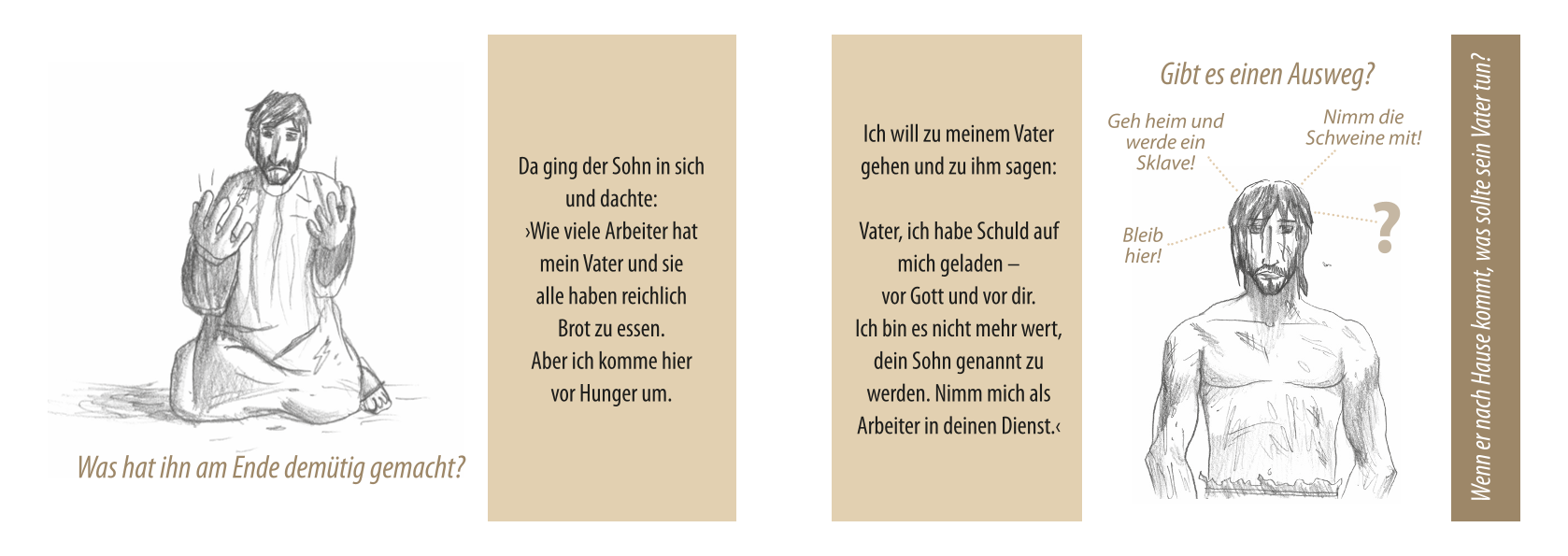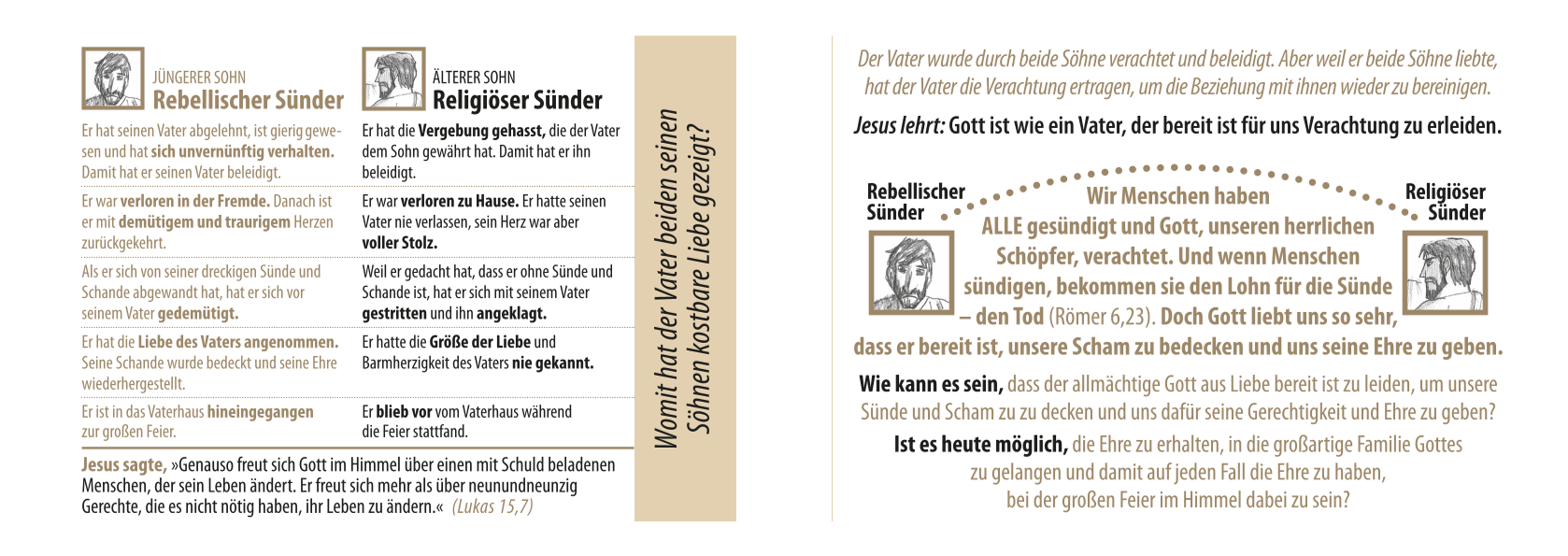 Im Anschluss wird das Verhalten und die Sünde der beiden Söhne gegenübergestellt, sowie die Bedeutung und das Evangelium anhand dieser Geschichte mit Bibelstellen erklärt. Wie groß die Liebe des allmächtigen Gottes zu uns ist, das er sogar das Kreuz für uns in Kauf nahm.