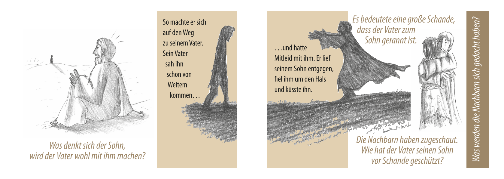 Der Schwerpunkt liegt dabei auf der Fragestellung "Wer bekommt seine Ehre wieder?" und greift dabei den orientalischen Kontext auf. Und lässt uns über das Verhalten des Vaters staunen, der dabei mit grundlegenden Regeln seiner Kultur brach.