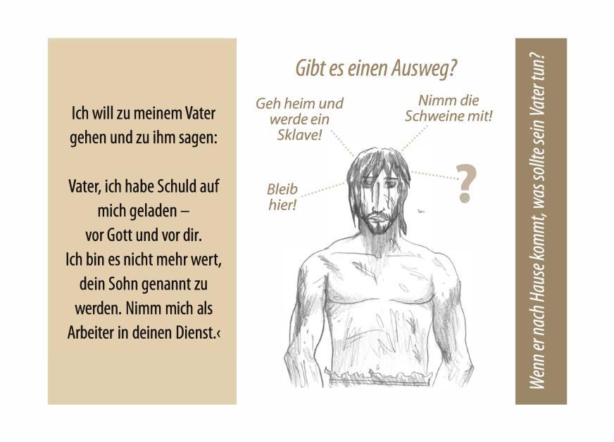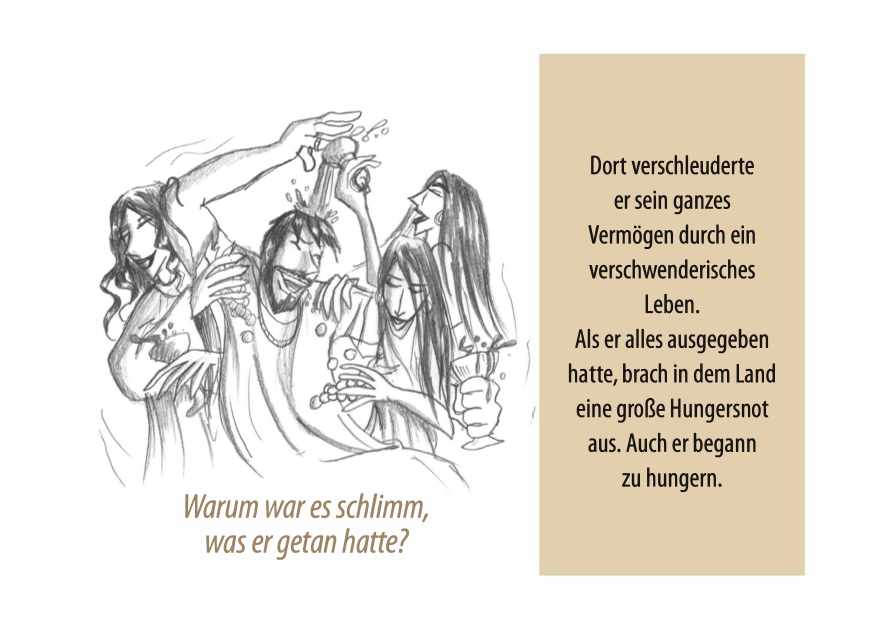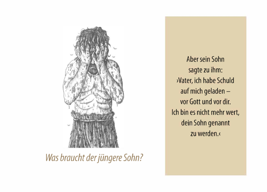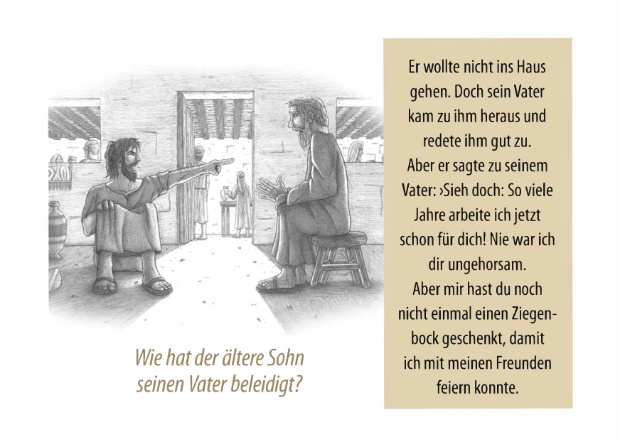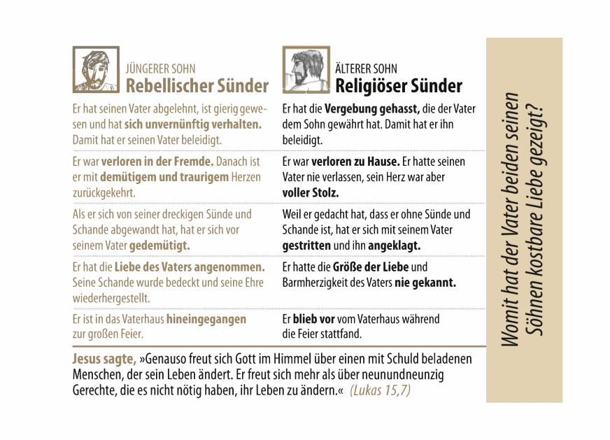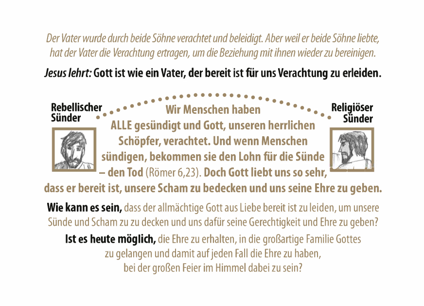 Im Anschluss wird das Verhalten und die Sünde der beiden Söhne gegenübergestellt, sowie die Bedeutung und das Evangelium anhand dieser Geschichte mit Bibelstellen erklärt. Wie groß die Liebe des allmächtigen Gottes zu uns ist, das er sogar das Kreuz für uns in Kauf nahm.