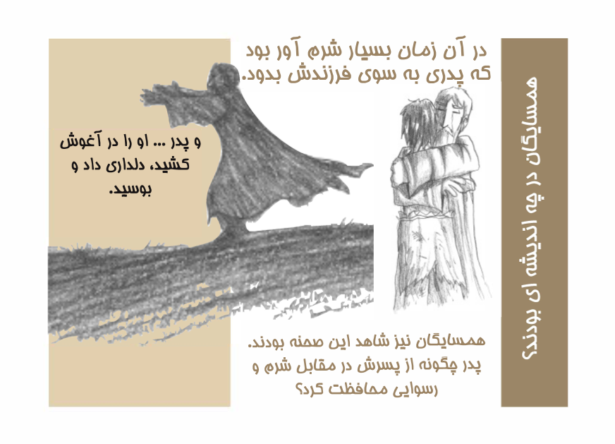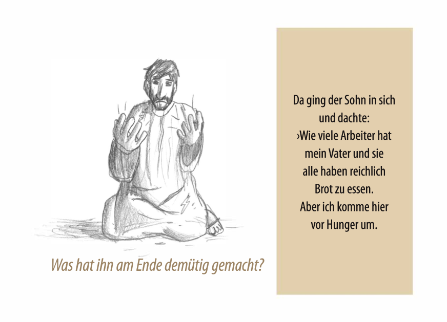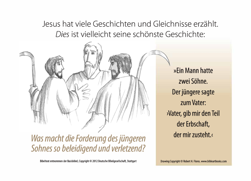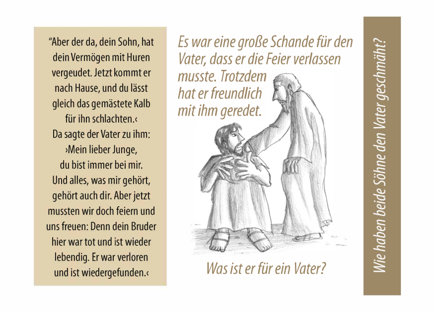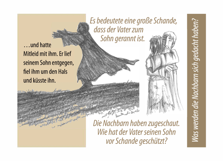 Der Schwerpunkt liegt dabei auf der Fragestellung "Wer bekommt seine Ehre wieder?" und greift dabei den orientalischen Kontext auf. Und lässt uns über das Verhalten des Vaters staunen, der dabei mit grundlegenden Regeln seiner Kultur brach.