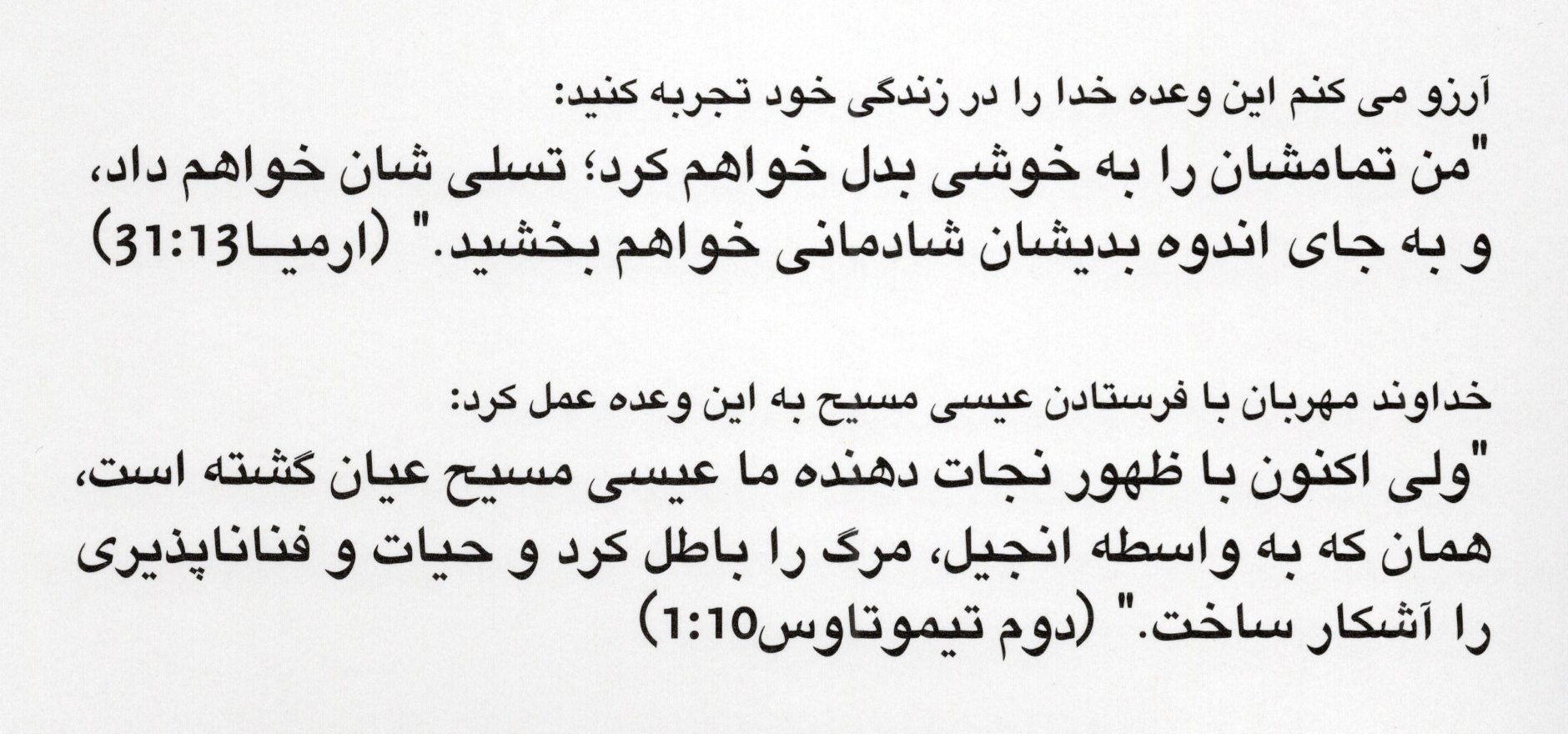 Links innen wird die Zusage Gottes vom Titel aufgenommen und mit den Bibelversen aus Jeremia 31,13 und 2. Tim. 1,10 bestärkt.