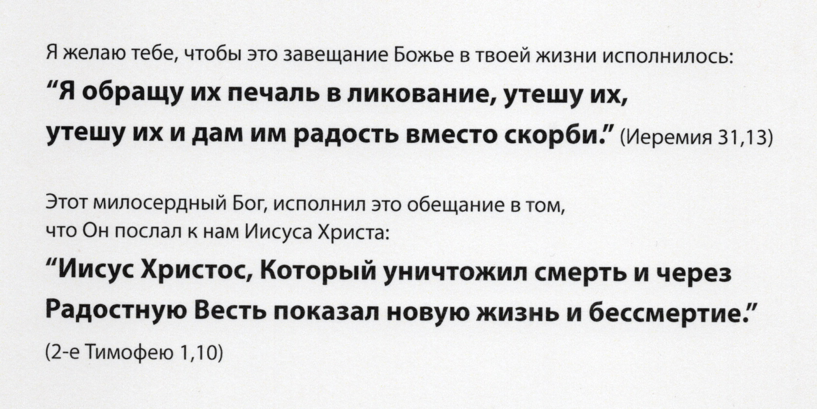 Links innen wird die Zusage Gottes vom Titel aufgenommen und mit den Bibelversen aus Jeremia 31,13 und 2. Tim. 1,10 bestärkt.