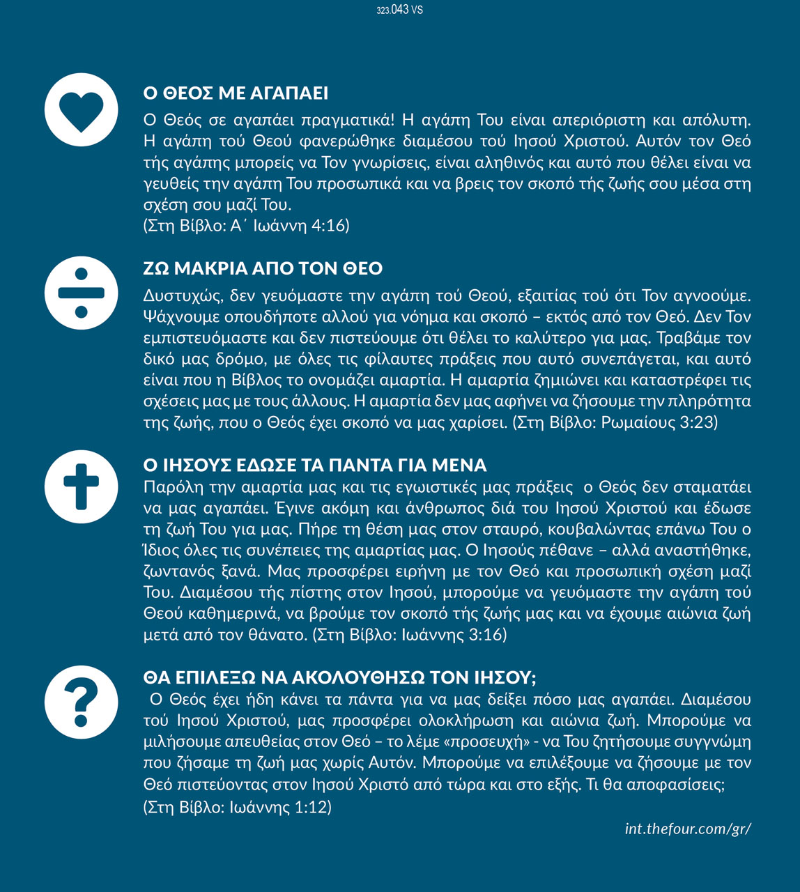 Das Evangelium wird anhand "The Four" und mit Verweis auf dazugehörigen Bibelstellen punktgenau erklärt: