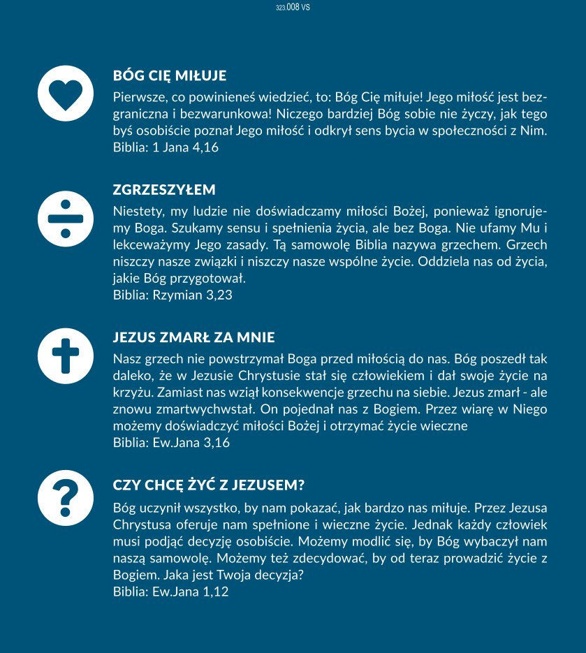 Das Evangelium wird anhand "The Four" und mit Verweis auf dazugehörigen Bibelstellen punktgenau erklärt:
