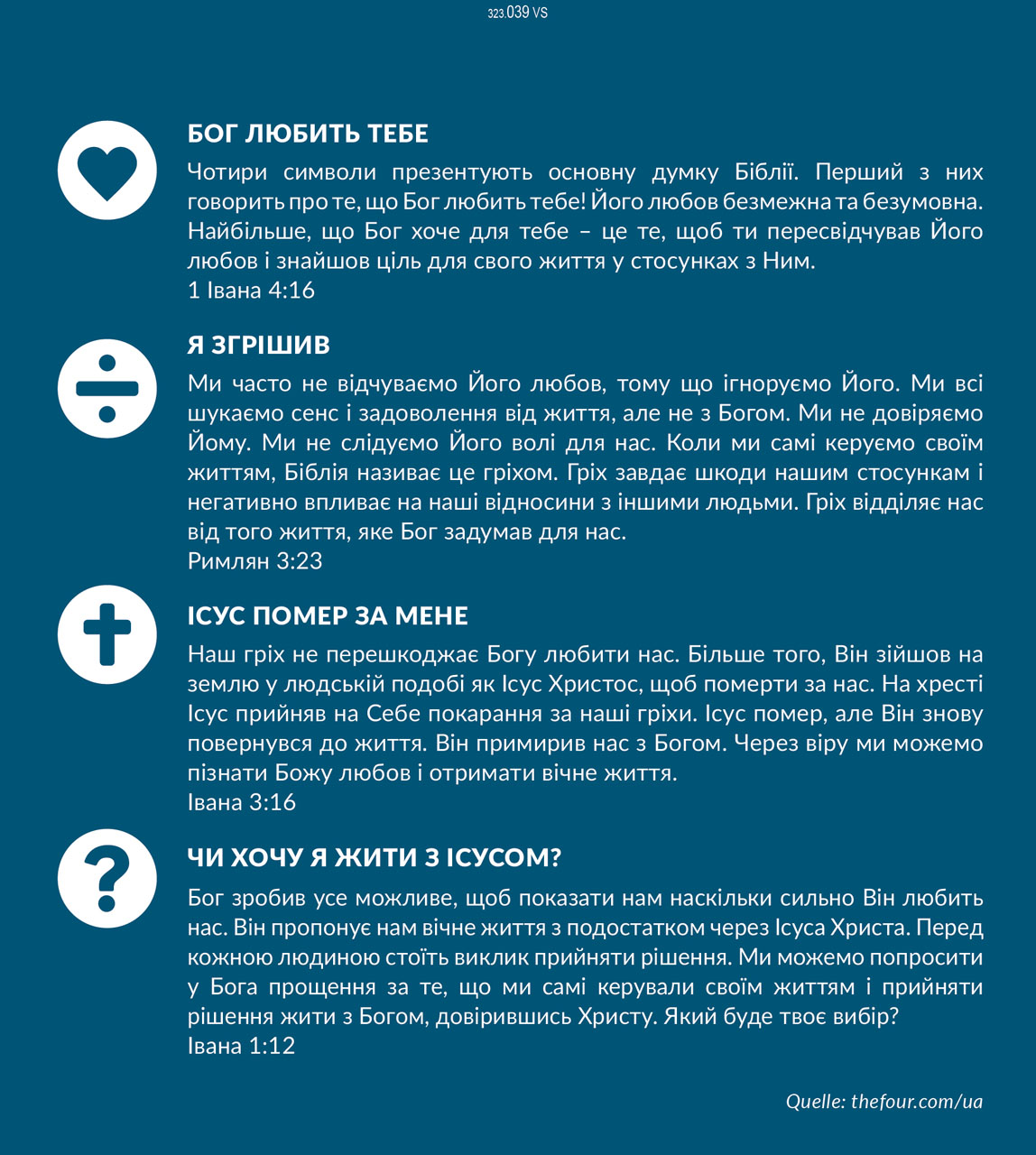 Das Evangelium wird anhand "The Four" und mit Verweis auf dazugehörigen Bibelstellen punktgenau erklärt: