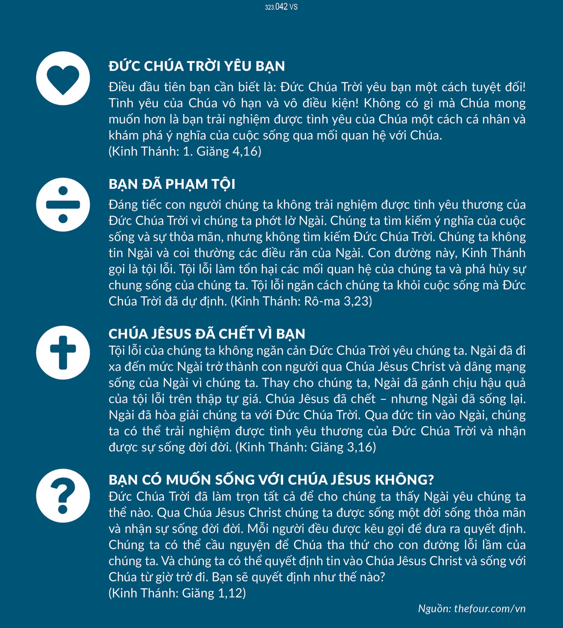 Das Evangelium wird anhand "The Four" und mit Verweis auf dazugehörigen Bibelstellen punktgenau erklärt: