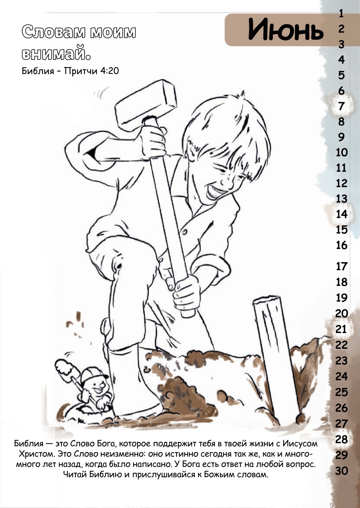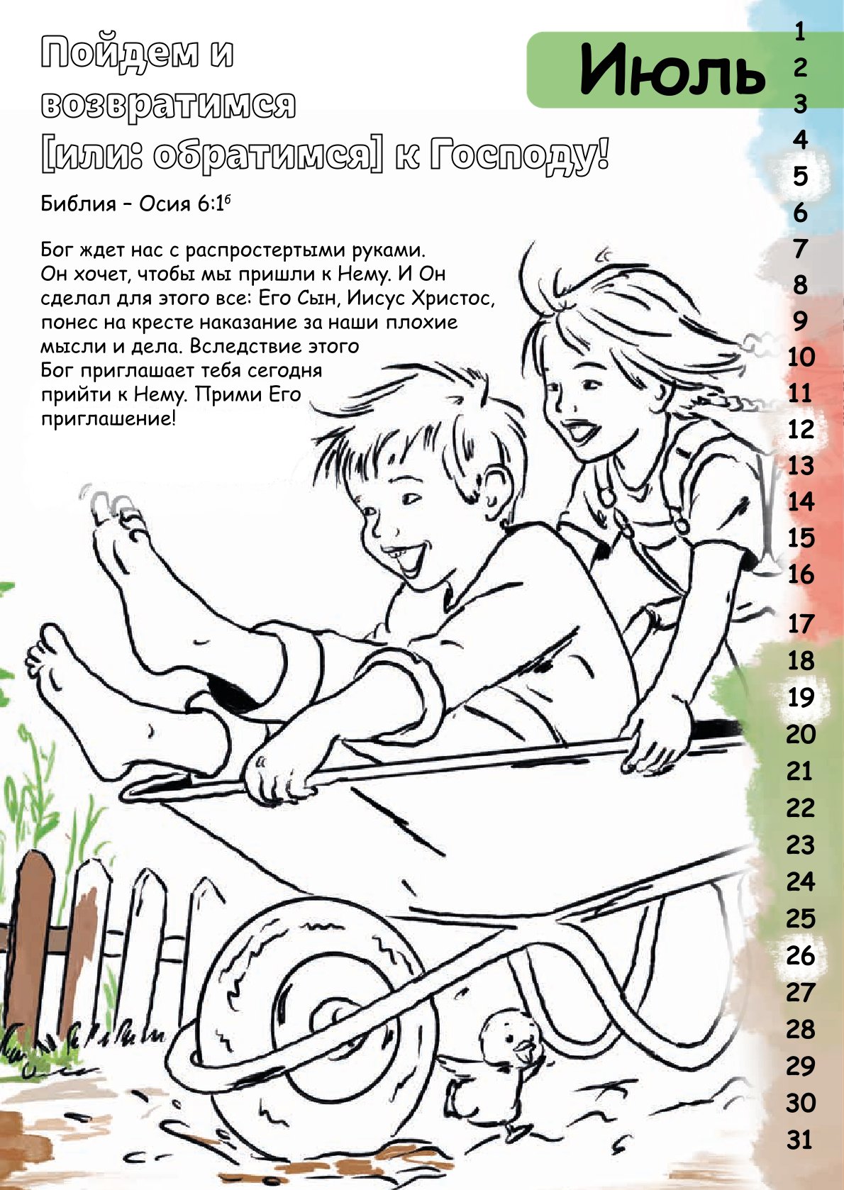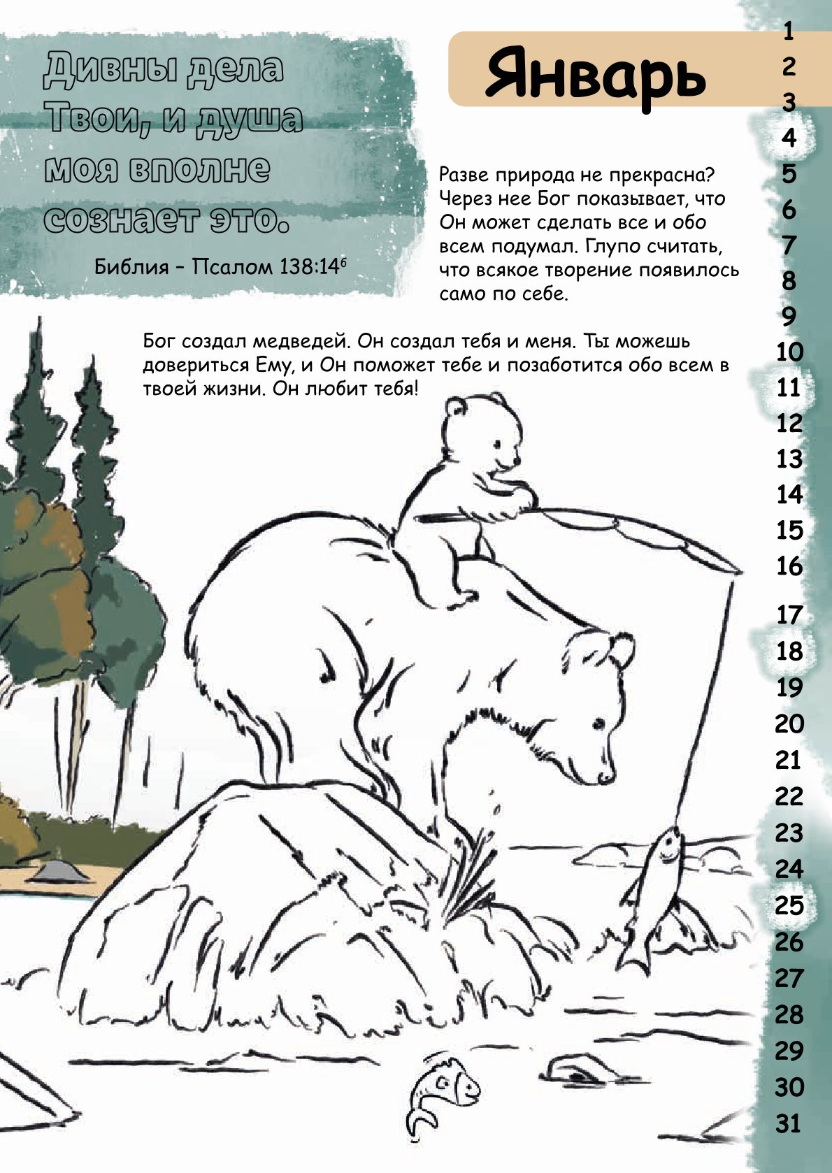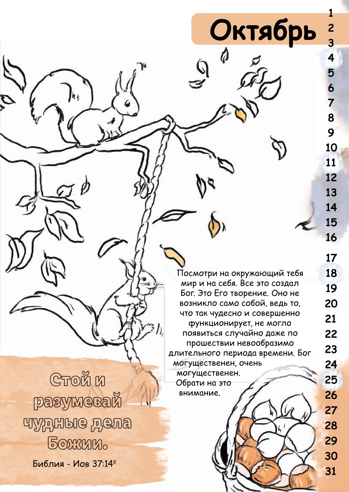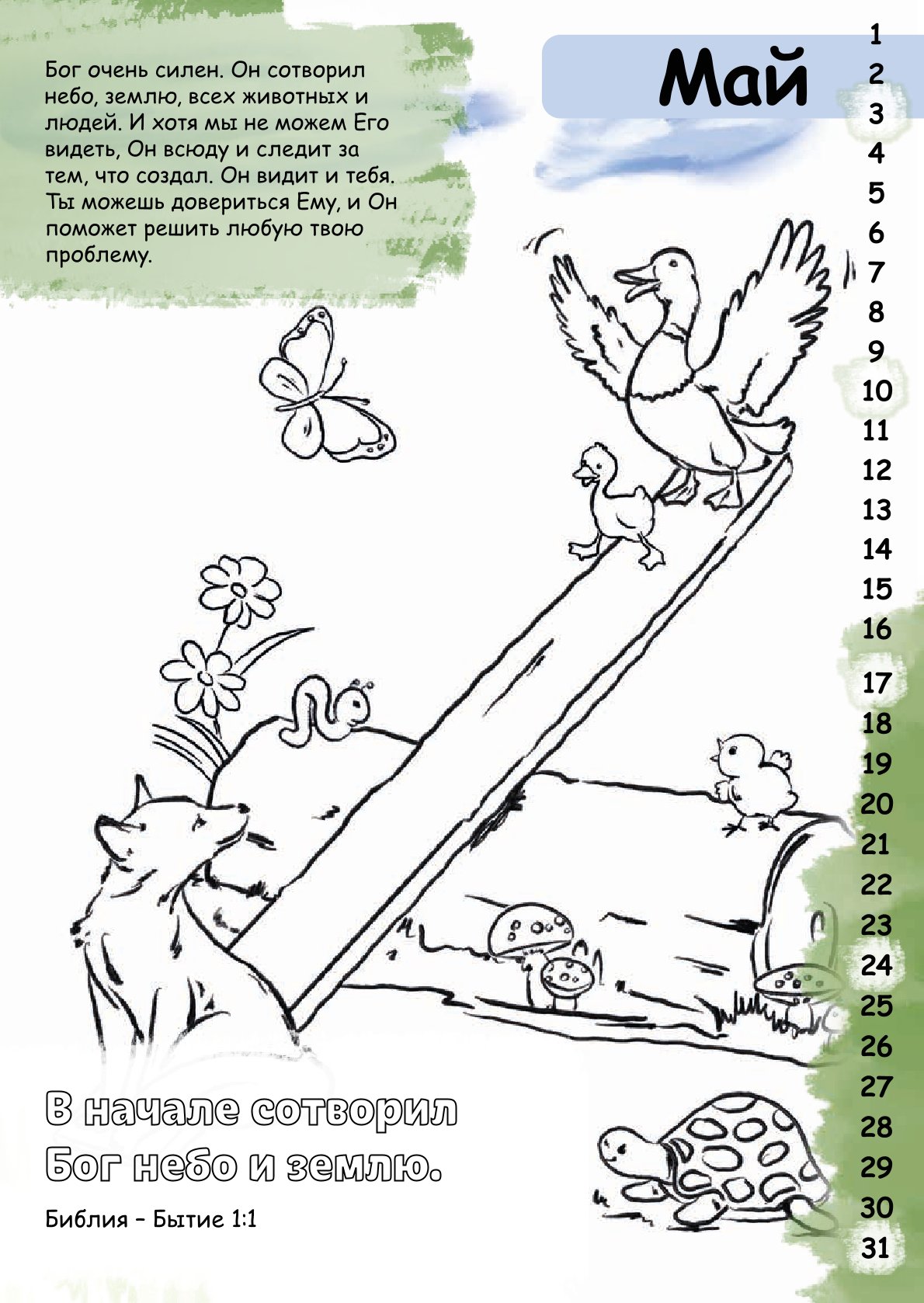 Der Malkalender enthält jeden Monat einen Bibelvers zum Auswendiglernen mit einem thematisch dazu passenden Bild zum Ausmalen.