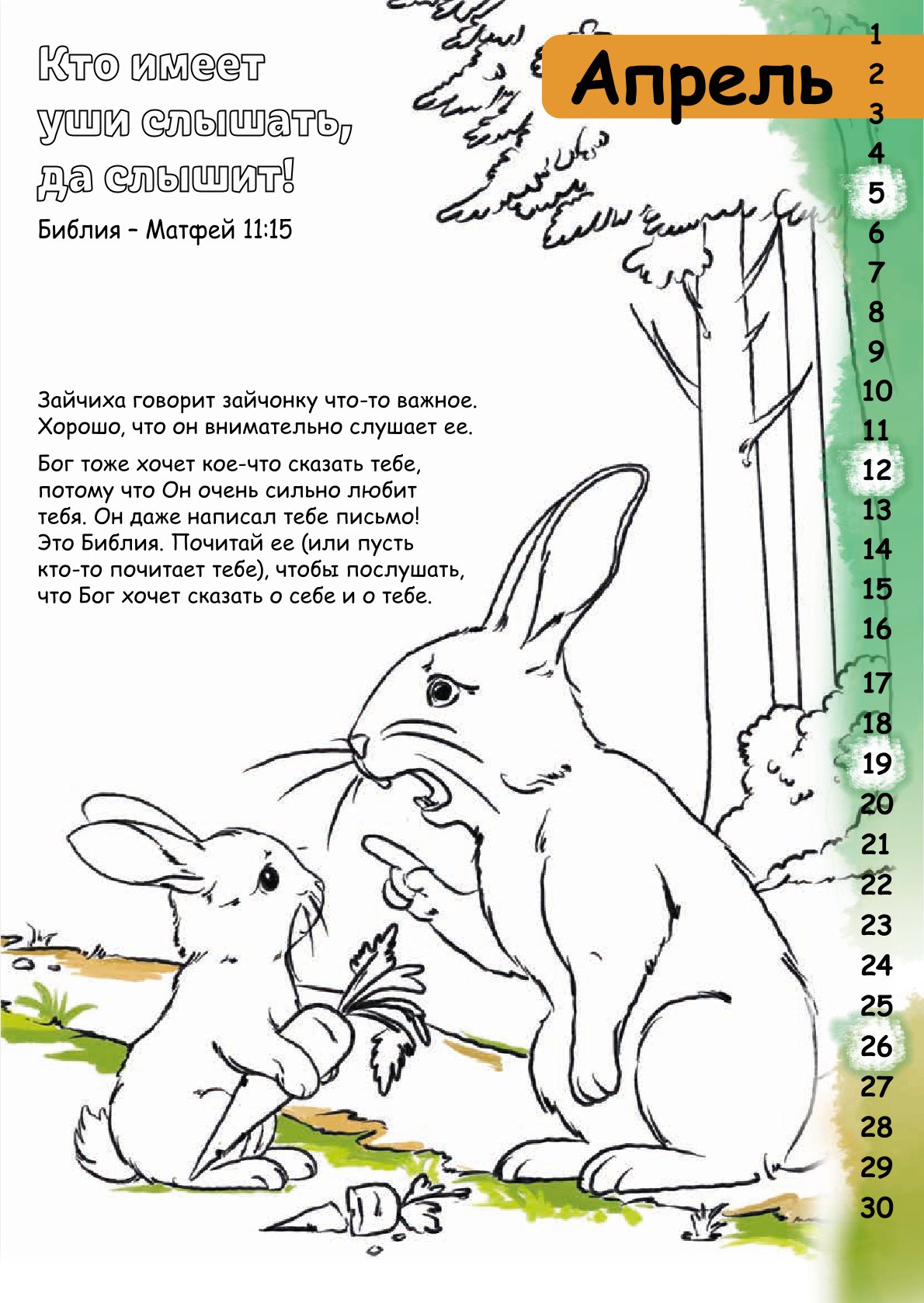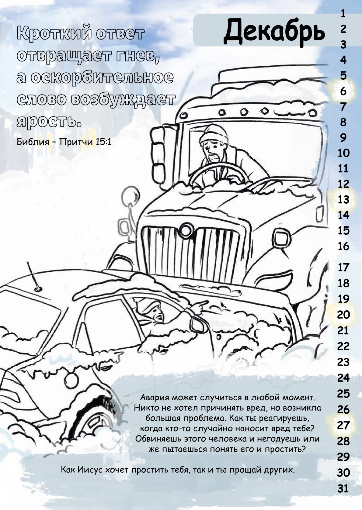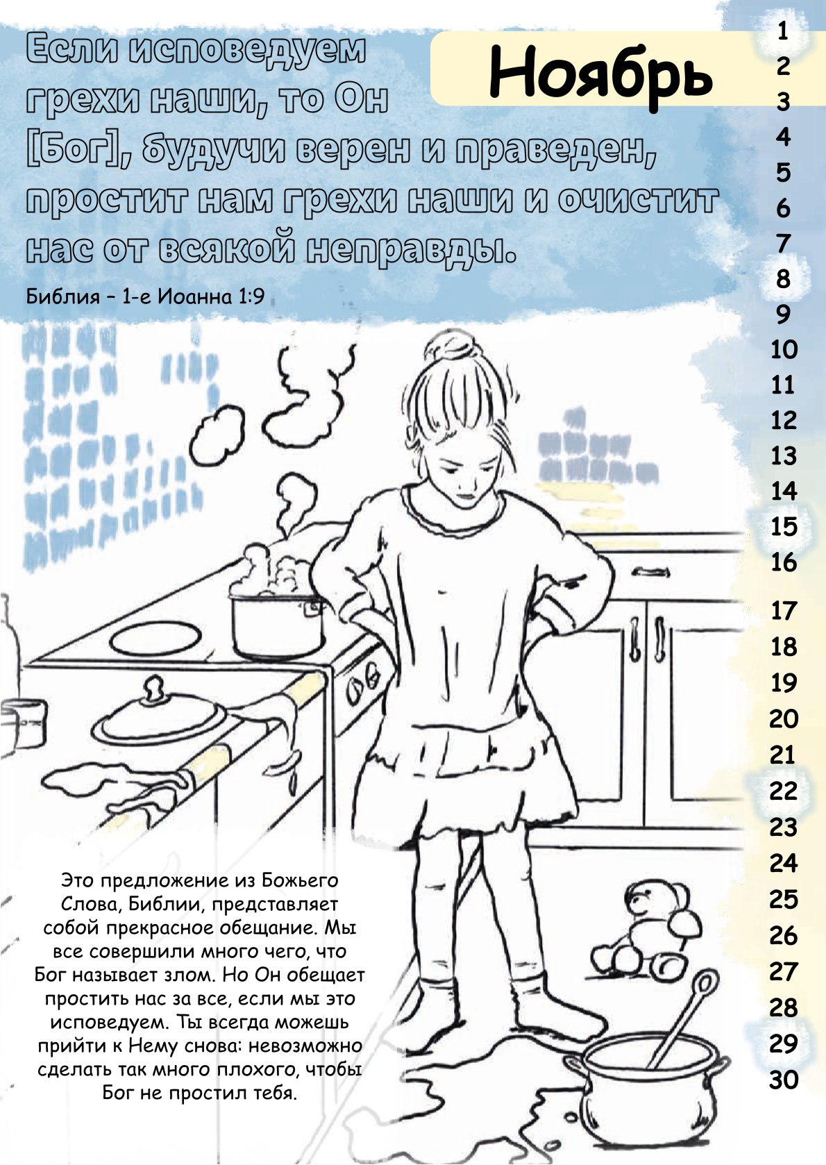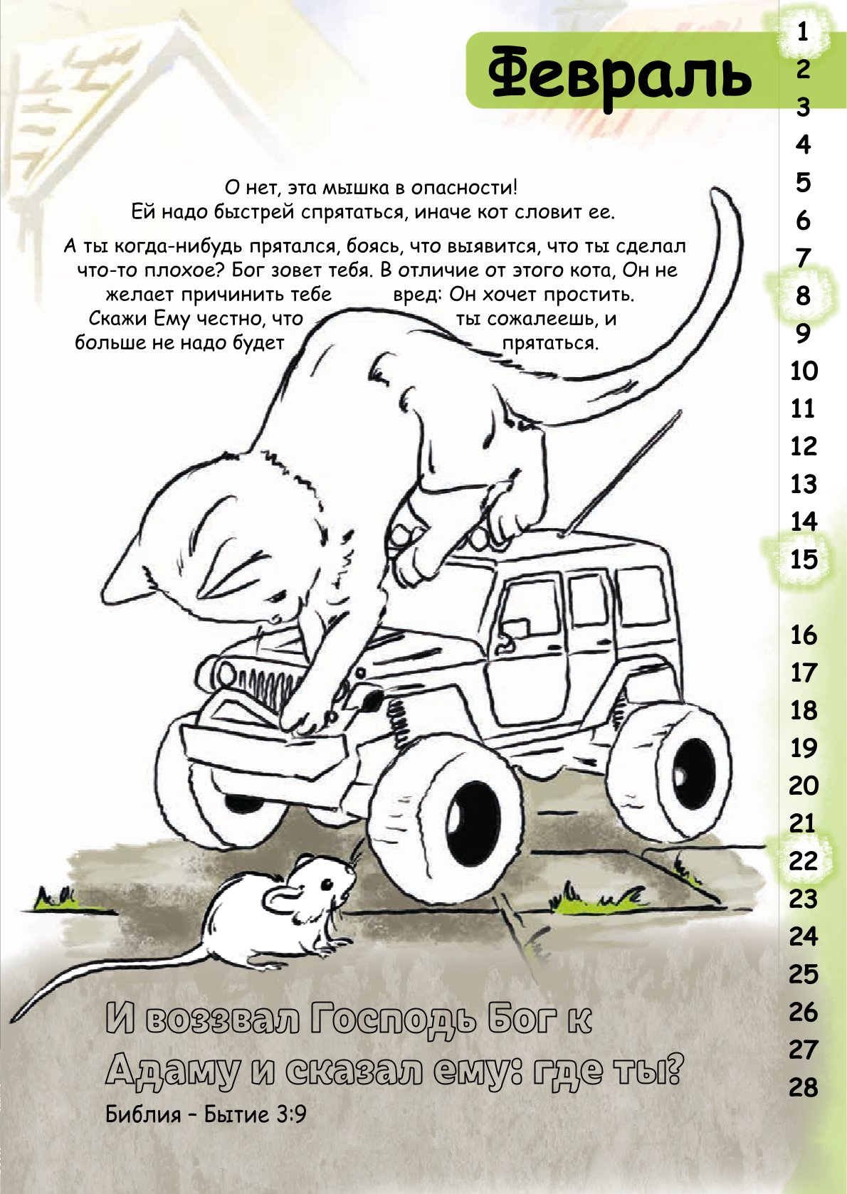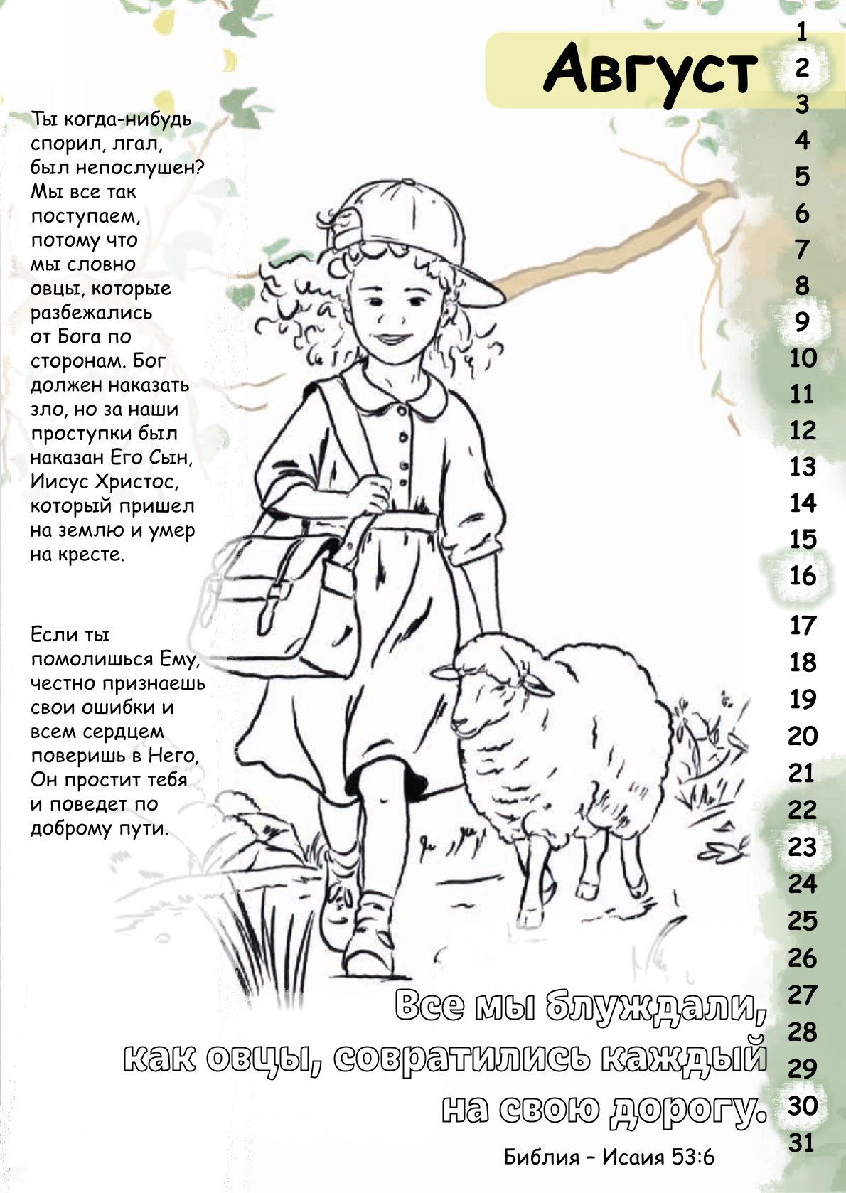 Der Malkalender enthält jeden Monat einen Bibelvers zum Auswendiglernen mit einem thematisch dazu passenden Bild zum Ausmalen.