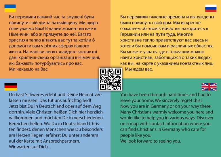 Die Karte ermöglicht auf einfache Weise per QR-Code den Zugriff auf Deutschland-Begleiter.de und damit auf die Landkarte, auf der christliche Gemeinden und Organisationen ihre Angebote für Geflüchtete eingetragen haben.