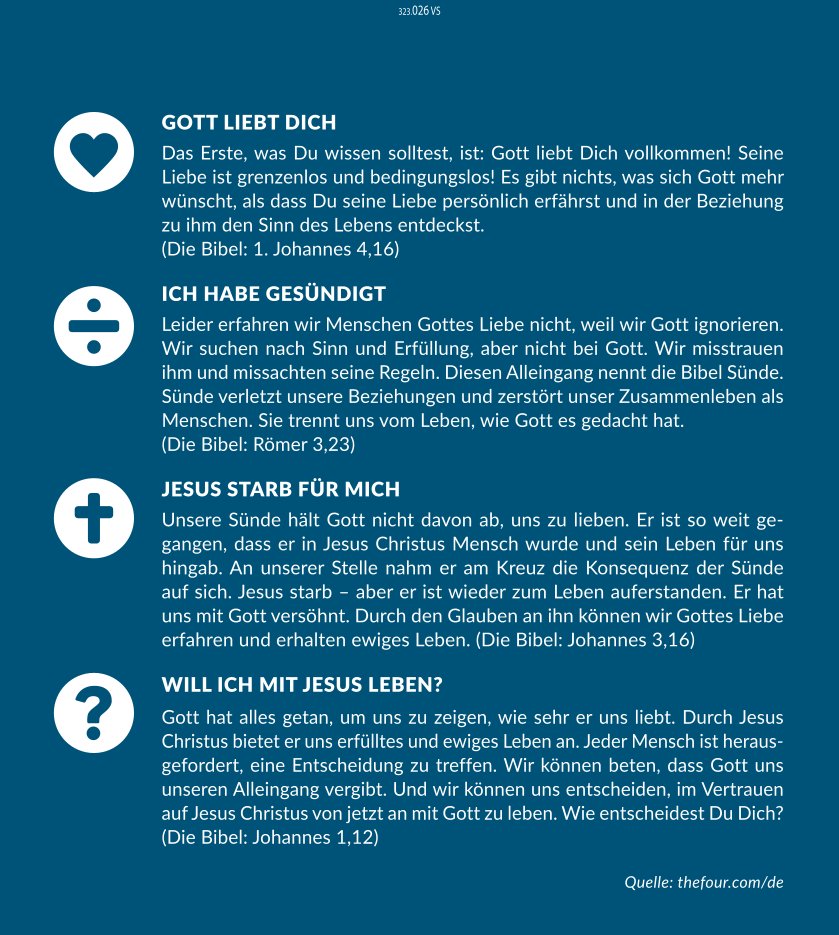 Das Evangelium wird anhand "The Four" und mit Verweis auf dazugehörigen Bibelstellen punktgenau erklärt: