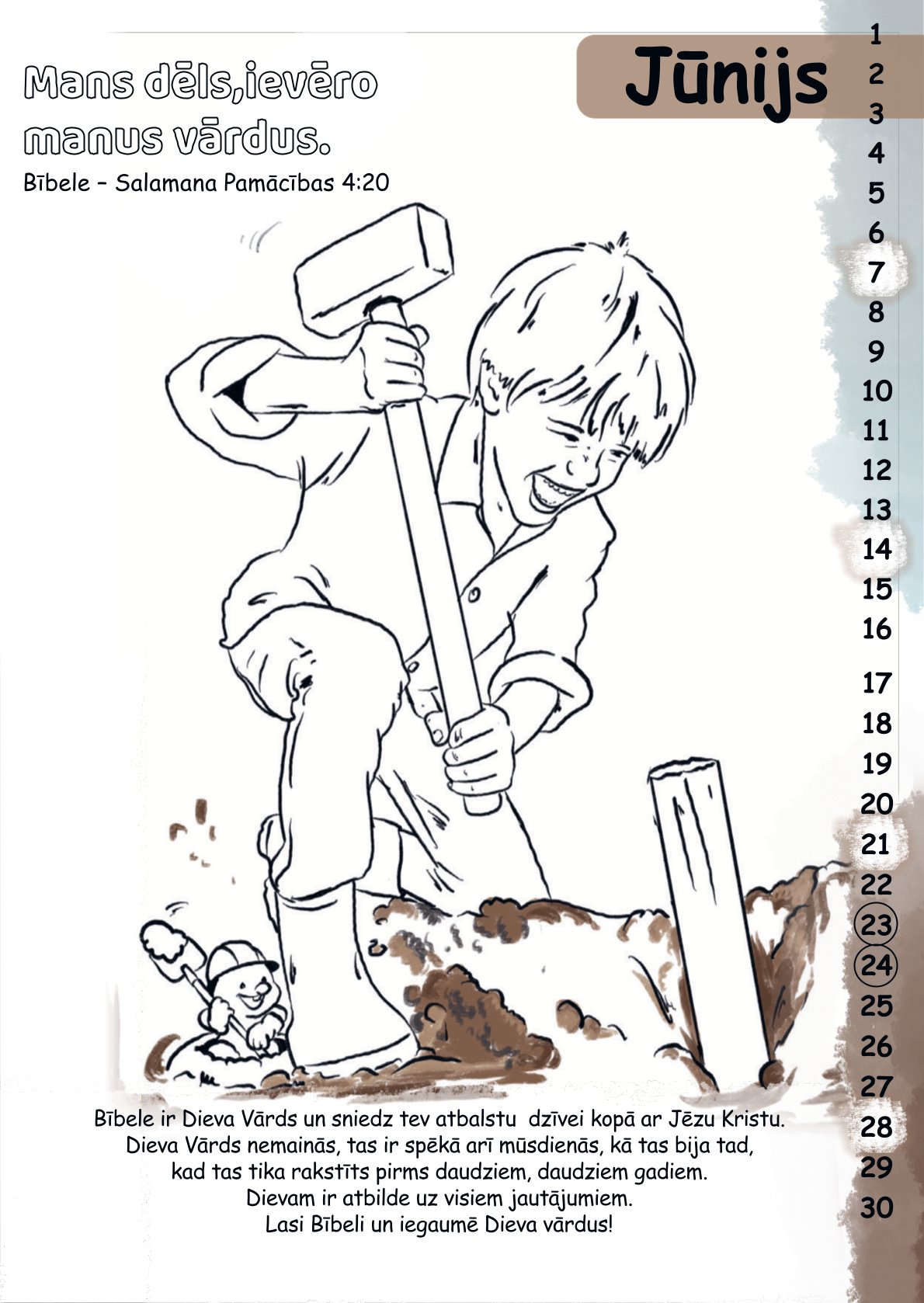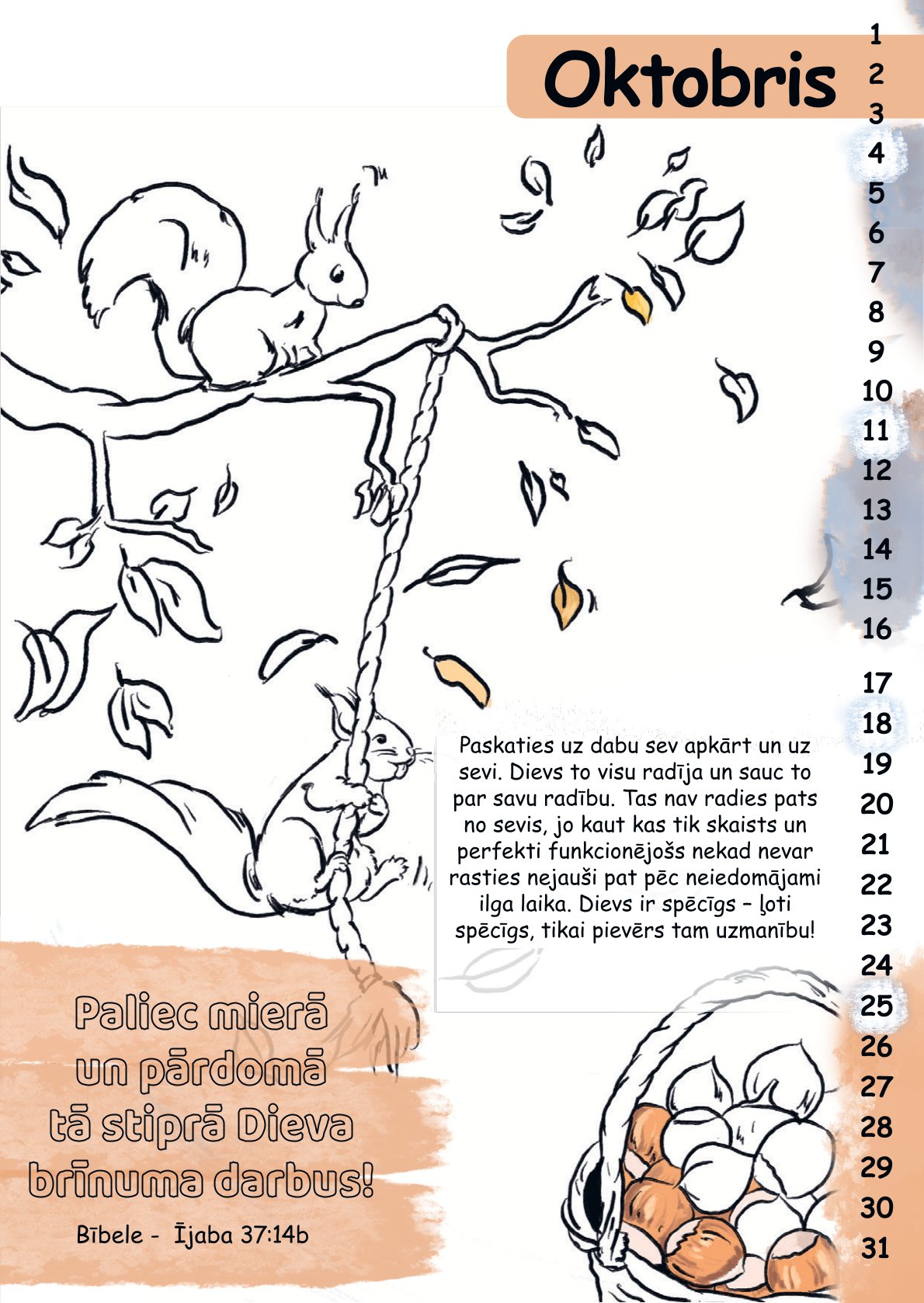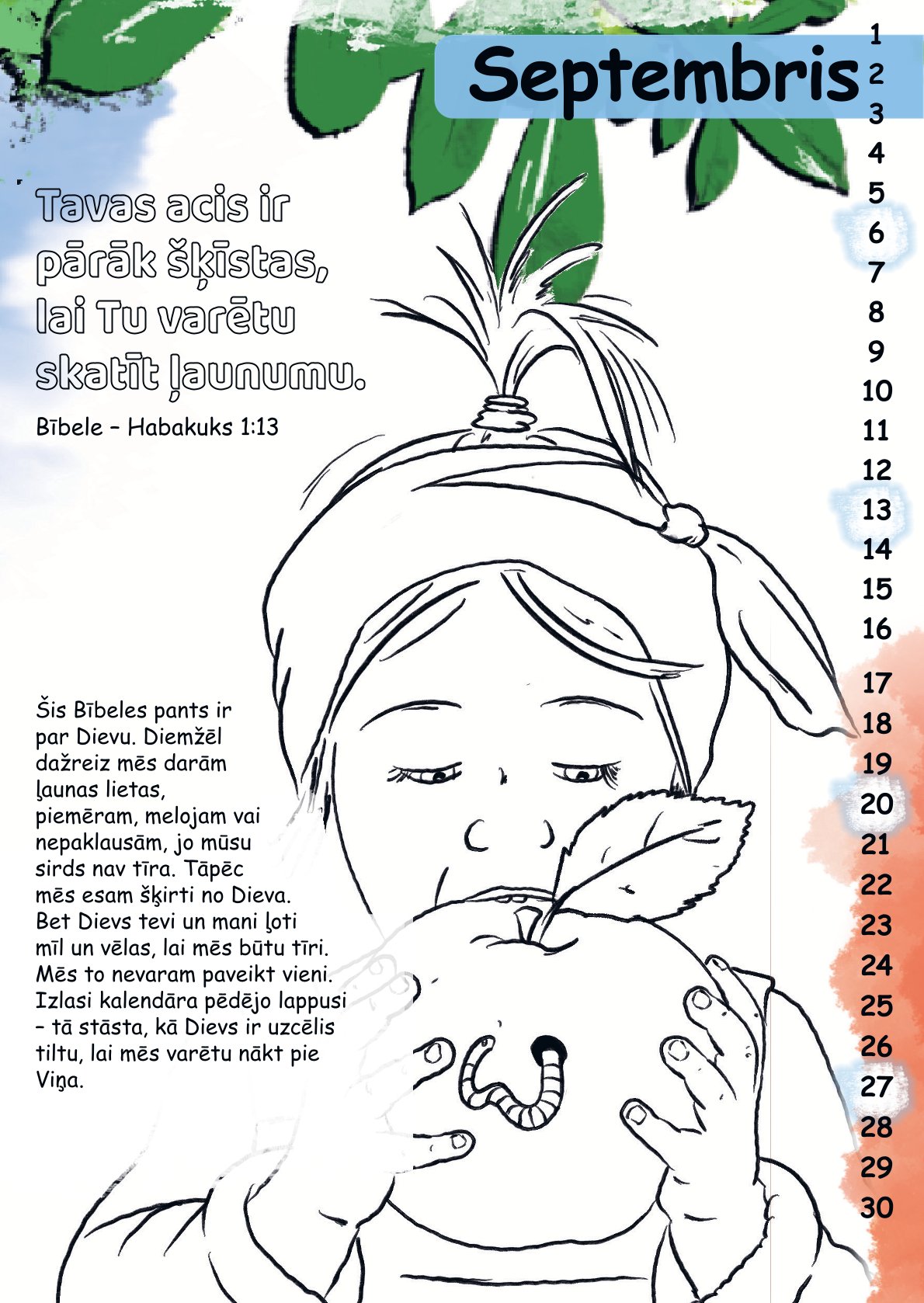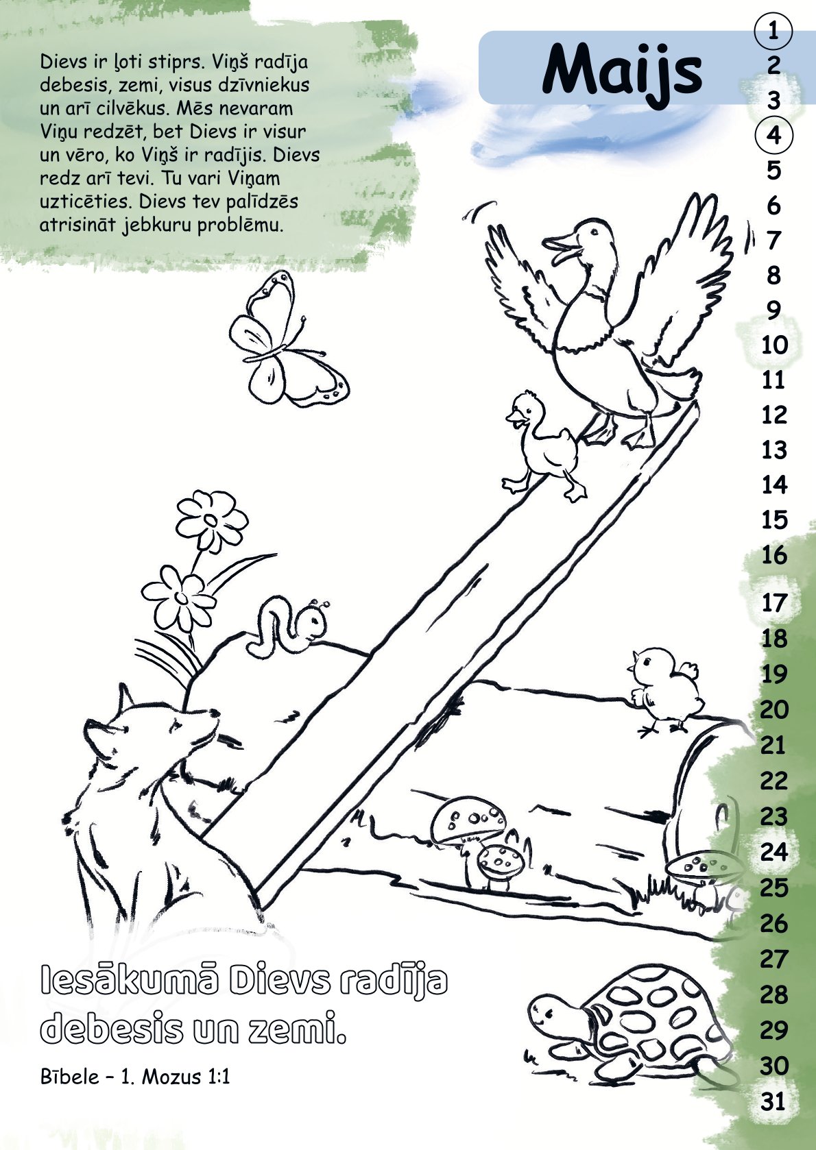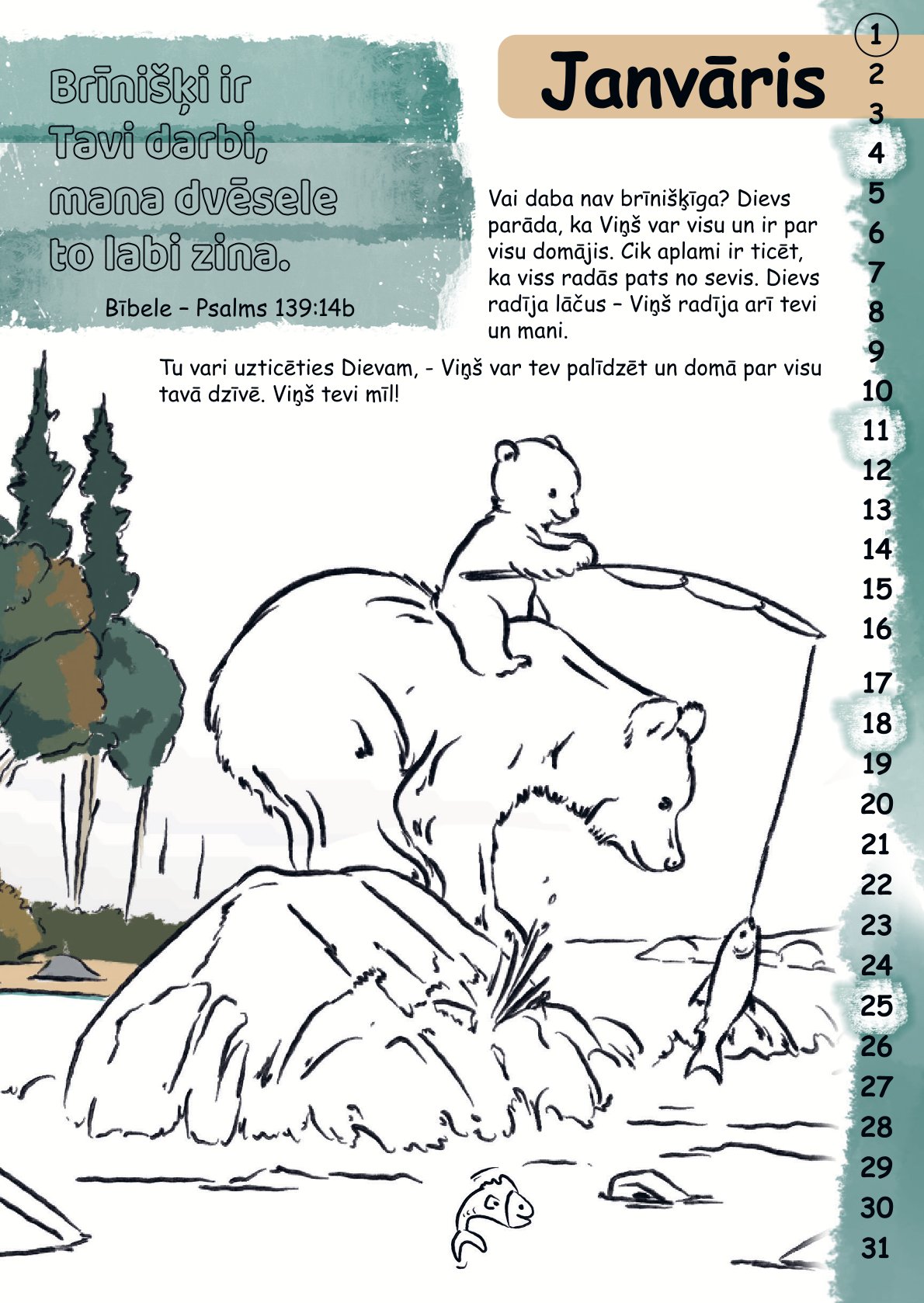 Der Malkalender enthält jeden Monat einen Bibelvers zum Auswendiglernen mit einem thematisch dazu passenden Bild zum Ausmalen.