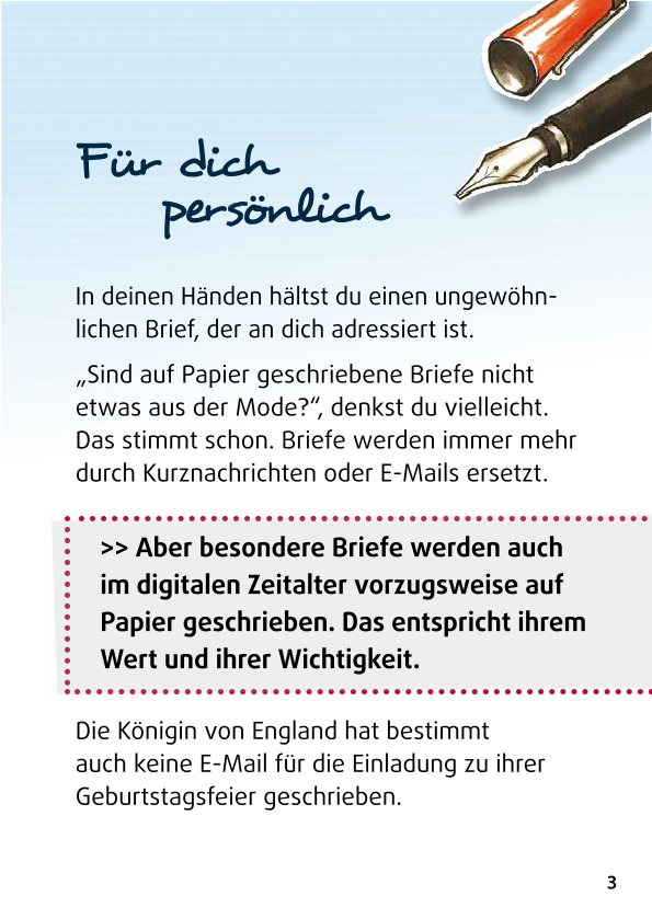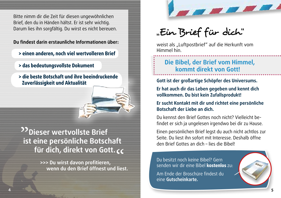 Dieses evangelistische Heft weist in einfacher, ansprechender Form auf einen wichtigen „Brief“ hin, auf die Bibel, den „Brief“, den Gott für uns hat aufschreiben lassen.